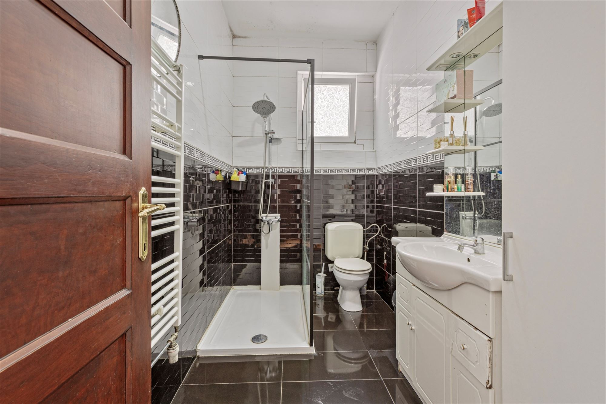 - Badkamer met douche, wastafel en toilet.