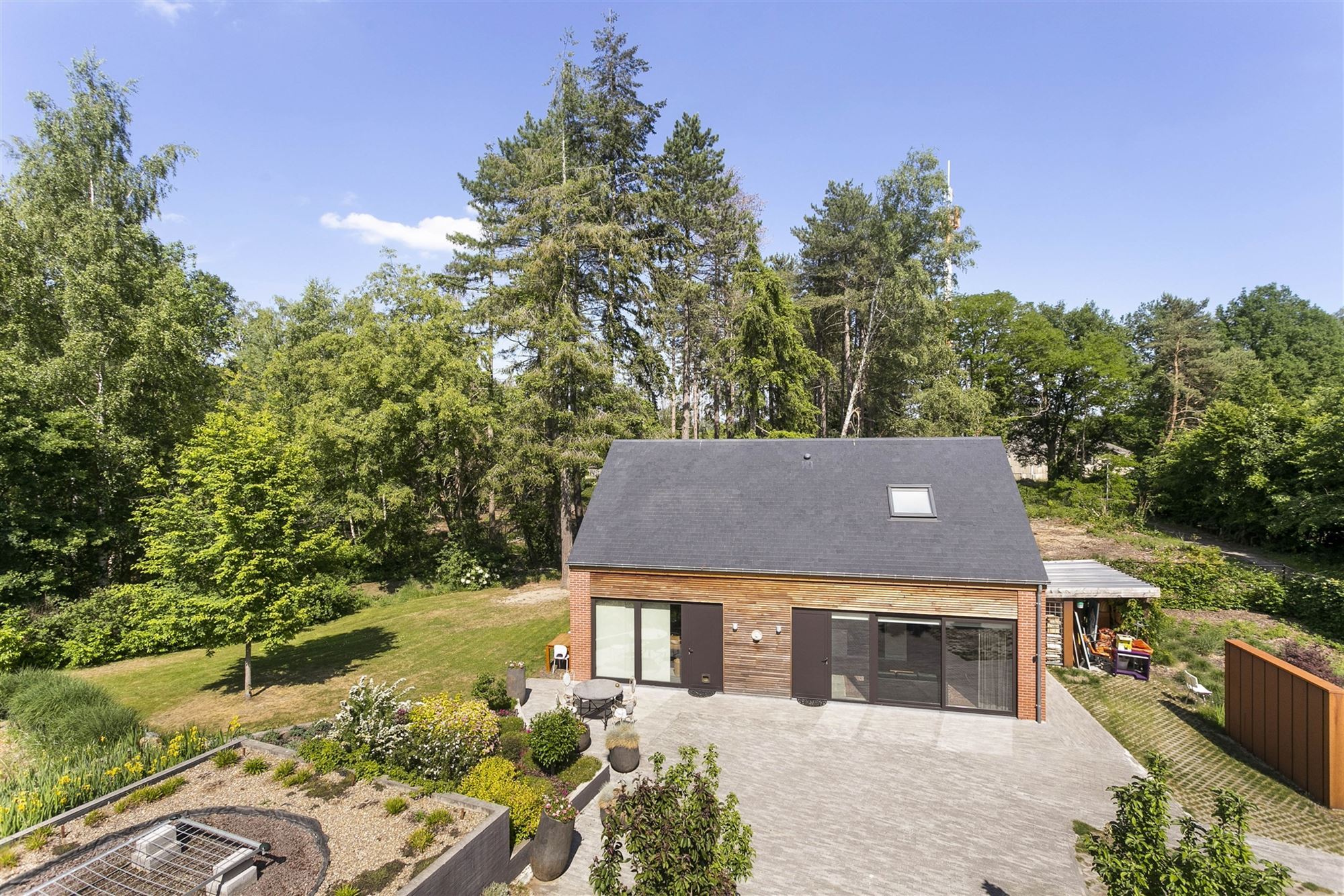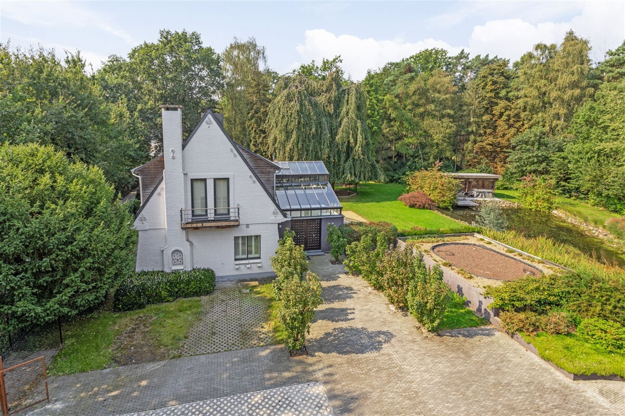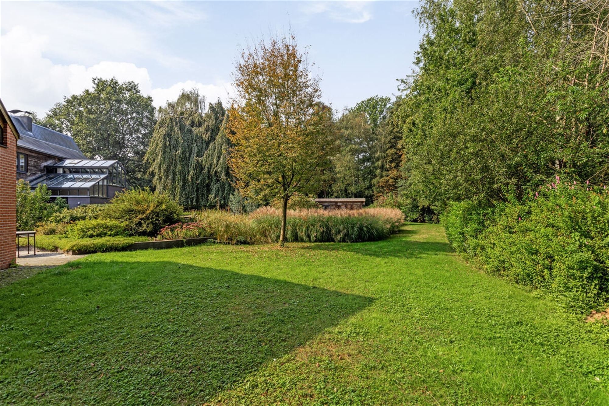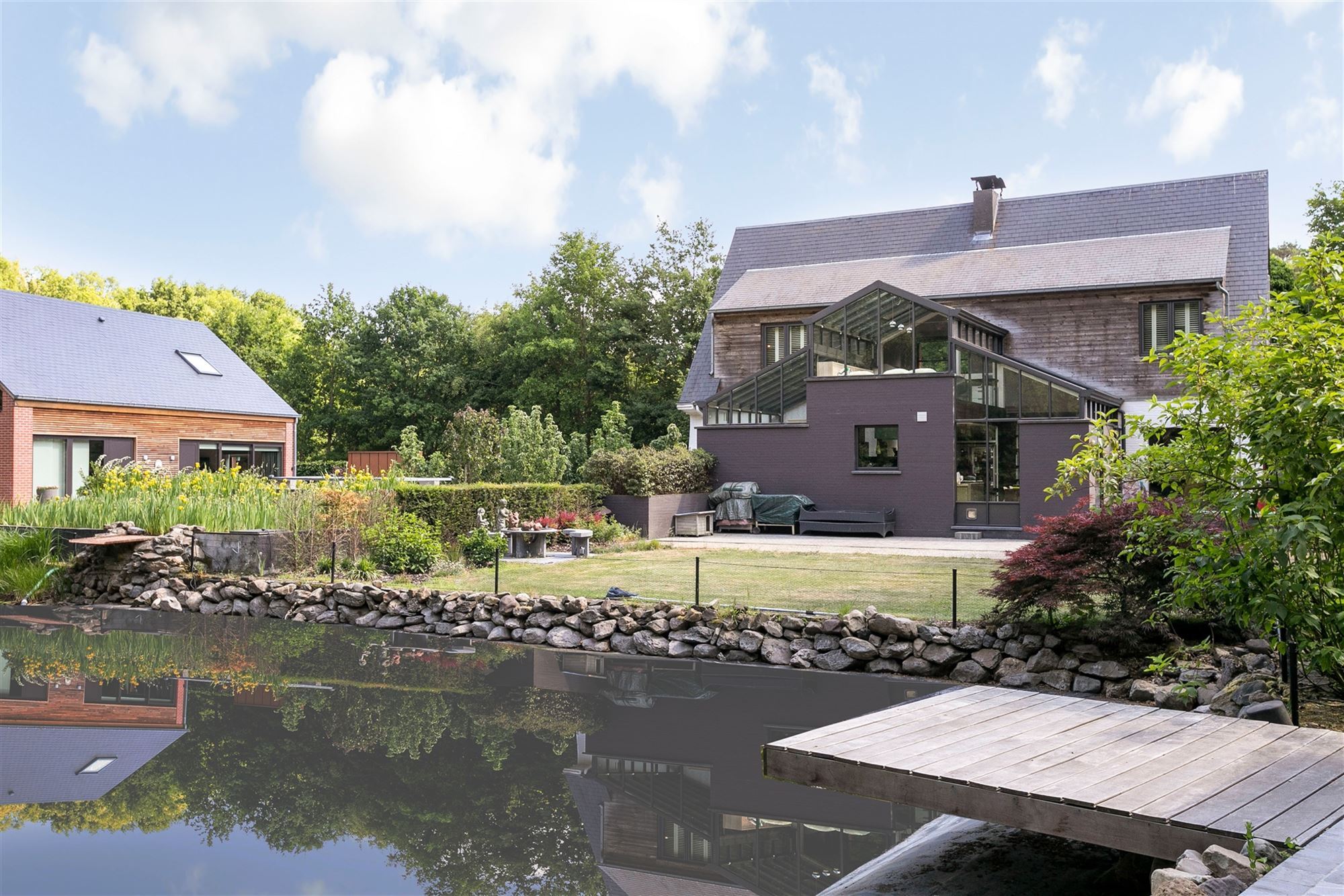 De buitenruimte van Hazendreef 11 is geen louter decoratief gegeven, maar vormt een essentieel onderdeel van de beleving. De tuin werd aangelegd met eenzelfde gevoel voor rust en natuurlijke structuur als het huis zelf. Geleidelijke overgangen tussen sierlijke beplanting, inheemse soorten en open graszones zorgen voor een landschappelijk geheel dat meeademt met de seizoenen. Het absolute middelpunt is de prachtig geïntegreerde zwemvijver, omzoomd door rietkragen en vaste planten, die niet alleen voor verkoeling zorgt op warme dagen, maar ook visueel rust brengt in het geheel. Terrassen, wandelpaden en zitplekken nodigen uit tot verpozing in de buitenlucht — telkens met zicht op het omringende groen dat volledige privacy garandeert.