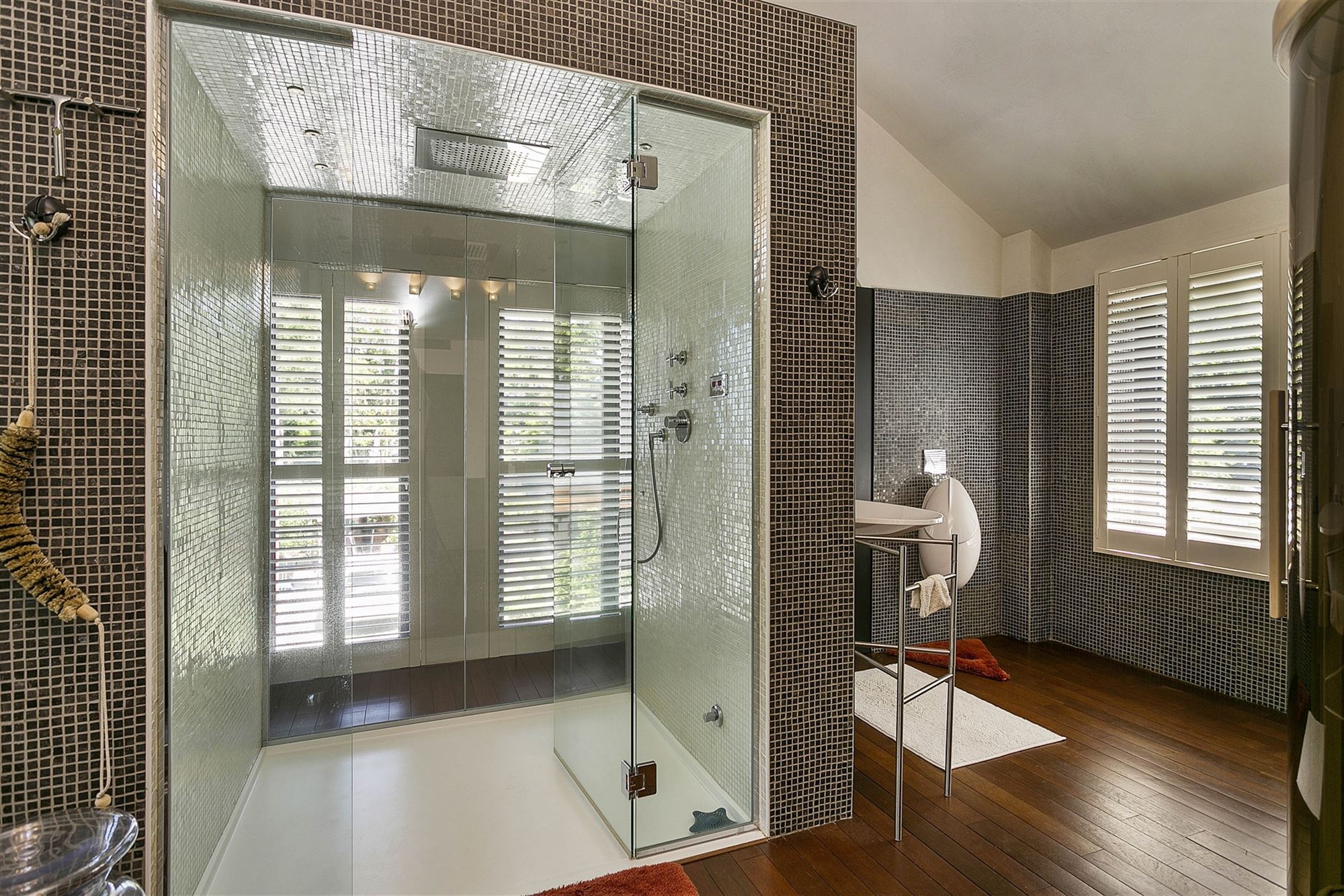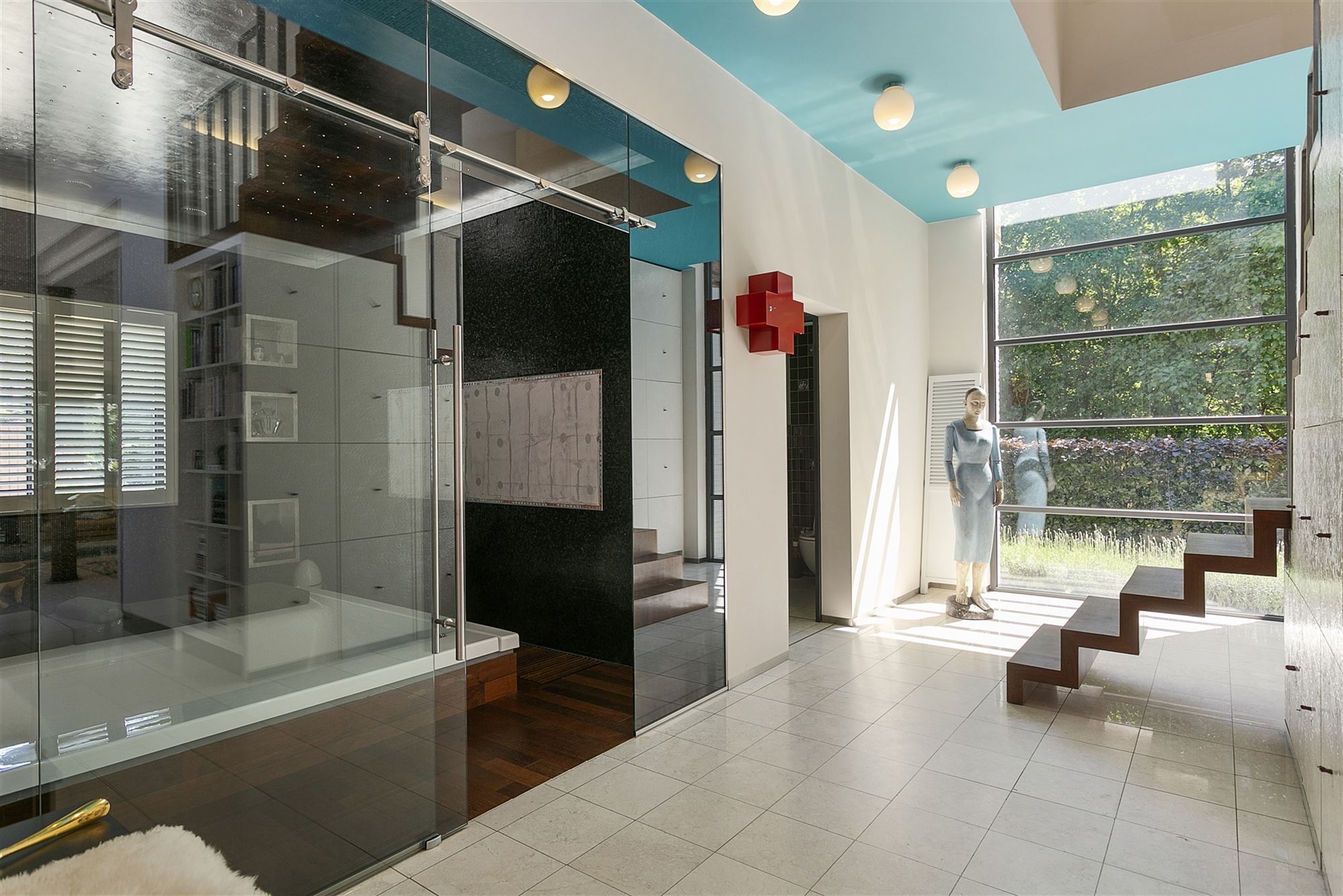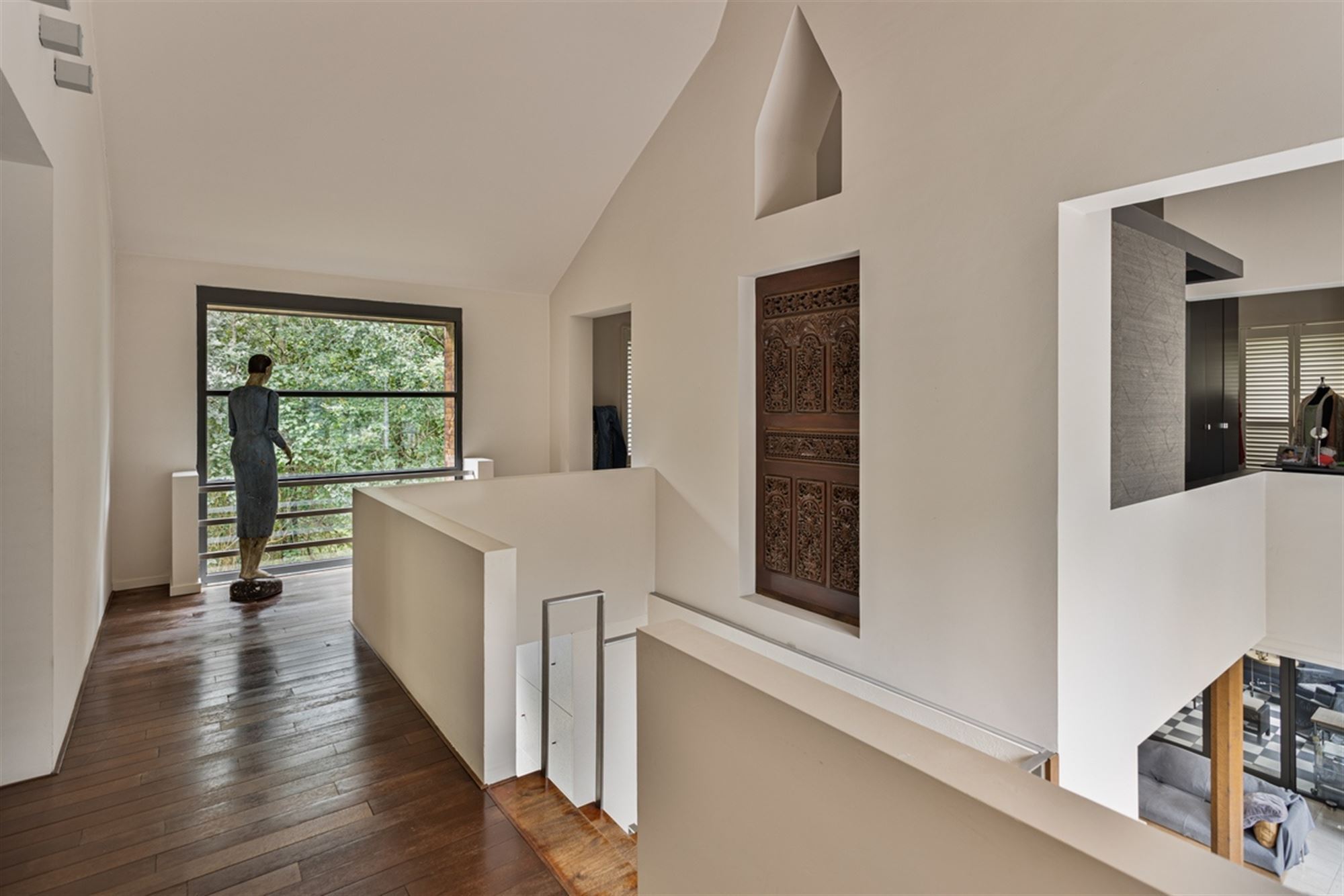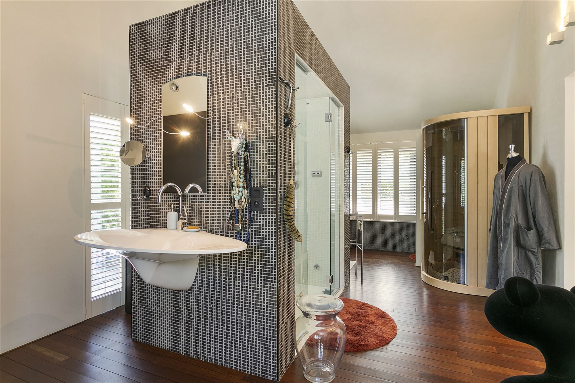 Binnenin wordt dezelfde ingetogen architecturale taal verdergezet. Warme houten vloeren contrasteren met de strakke witpleister en de zwart omlijnde accenten, terwijl decoratieve elementen – zoals de handgesneden houten panelen – een culturele gelaagdheid toevoegen aan de verder minimalistische ruimte. De badkamer is ontworpen als een rustgevende cocon, met donkere mozaïektegels, een royale inloopdouche, een ligbad en zelfs een privé-sauna: een spa-ervaring in eigen huis. De leefruimtes zijn open, maar kennen ook hun intimiteit dankzij de strategische indeling. De glazen wintertuin vormt letterlijk en figuurlijk het lichtpunt van de woning — een plek om te werken, te lezen of gewoon te zijn, met zicht op de diepgroene tuin.
