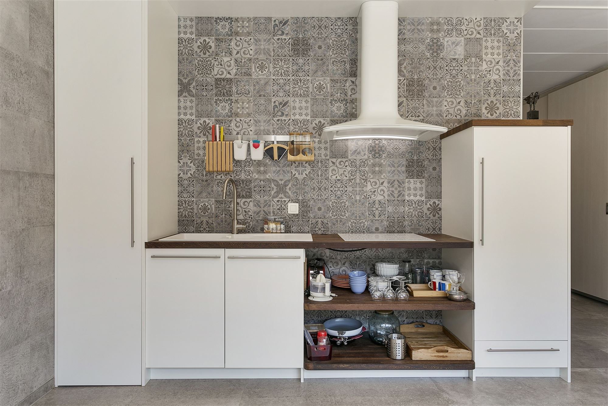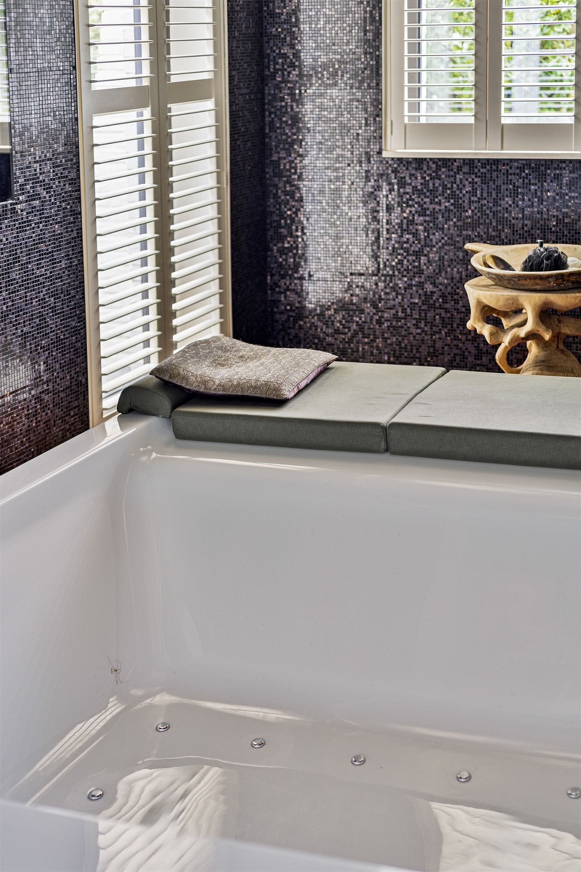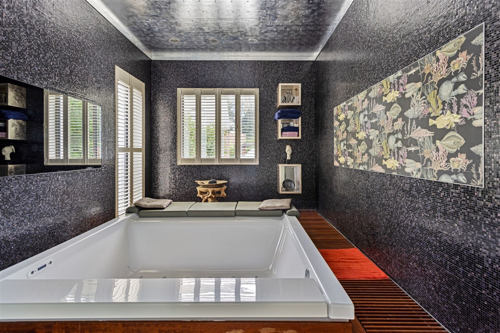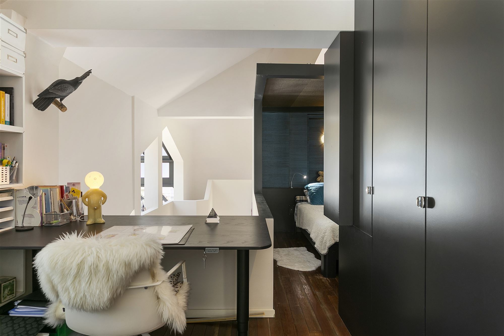 Binnenin wordt dezelfde ingetogen architecturale taal verdergezet. Warme houten vloeren contrasteren met de strakke witpleister en de zwart omlijnde accenten, terwijl decoratieve elementen – zoals de handgesneden houten panelen – een culturele gelaagdheid toevoegen aan de verder minimalistische ruimte. De badkamer is ontworpen als een rustgevende cocon, met donkere mozaïektegels, een royale inloopdouche, een ligbad en zelfs een privé-sauna: een spa-ervaring in eigen huis. De leefruimtes zijn open, maar kennen ook hun intimiteit dankzij de strategische indeling. De glazen wintertuin vormt letterlijk en figuurlijk het lichtpunt van de woning — een plek om te werken, te lezen of gewoon te zijn, met zicht op de diepgroene tuin.