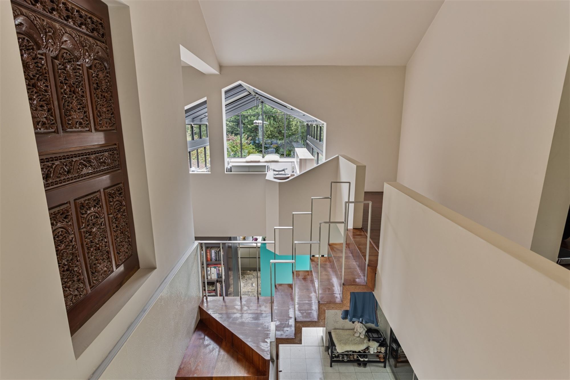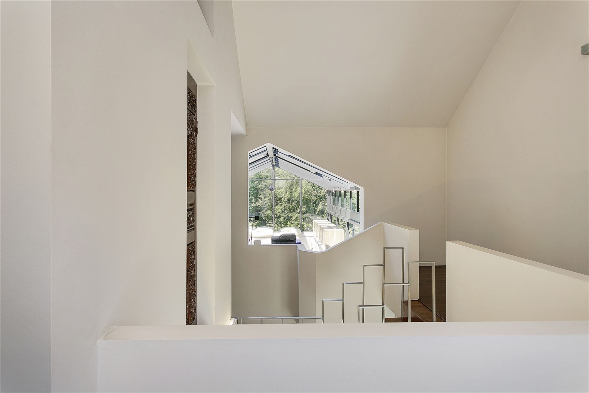De woning werd niet louter functioneel herdacht, maar als een doorleefde totaalervaring. Elk volume, elke lijn, elk detail draagt bij aan een verhaal dat zich langzaam ontvouwt terwijl je je door de woning beweegt. De centrale trappartij is een uitgesproken architecturaal statement – als een sculptuur middenin de woning die niet alleen verbindt, maar ook kadreert en geleidt. Grote, asymmetrische raampartijen zorgen voor een boeiend lichtspel op verschillende momenten van de dag en versterken het contact met de tuin en de omliggende natuur. Door de uitgekiende plaatsing van openingen en vides ontstaan er doorkijken die diepte geven en voortdurend verrassen. Binnen en buiten worden in deze woning geen gescheiden werelden, maar zijn subtiel met elkaar verweven.
